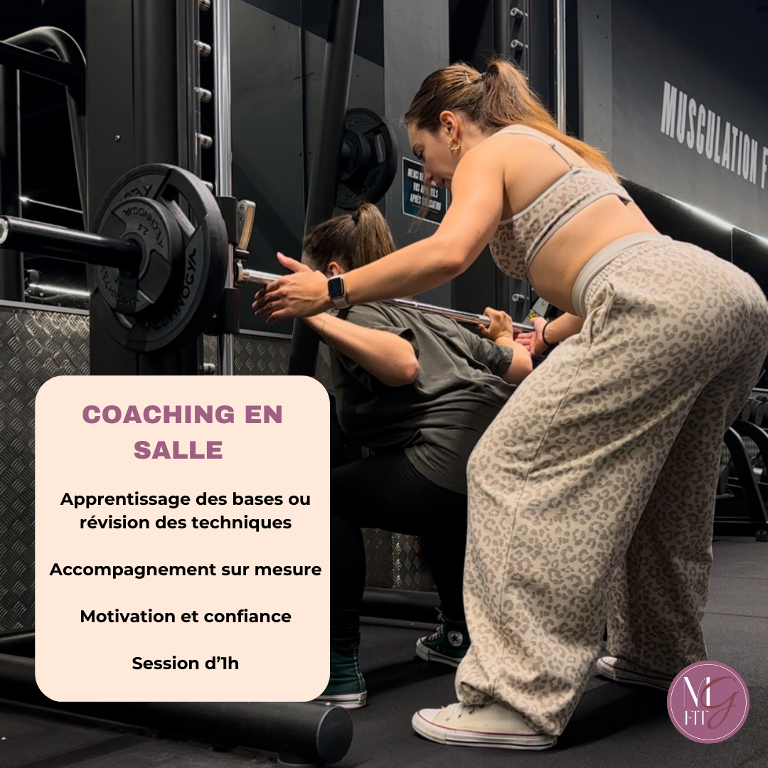 Un accompagnement 100% personnalisé directement en salle de sport. Je t’apprends à utiliser les machines en toute sécurité, à exécuter les bons mouvements et à trouver la bonne intensité pour progresser.